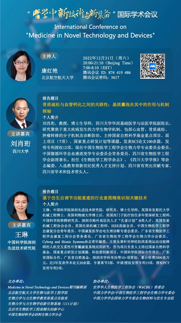 本次会议由Medicine in Novel Technology and Devices期刊编辑部、北京亚洲成人在线一二三四五六区生物与医学工程学院、生物力学与力生物学教育部重点实验室、生物力学与力生物学创新引智基地(111计划)、北京市生物医学工程高精尖创新中心、中国生物材料学会材料生物力学分会主办,由世界华人生物医学工程协会(WACBE)青委会、中国力学学会/中国生物医学工程学会生物力学专委会、中国力学学会固体力学专委会生物材料与仿生专业组协办,医学中新技术与新装备国际学术会议将于2022年11月-12月以线上方式举办。